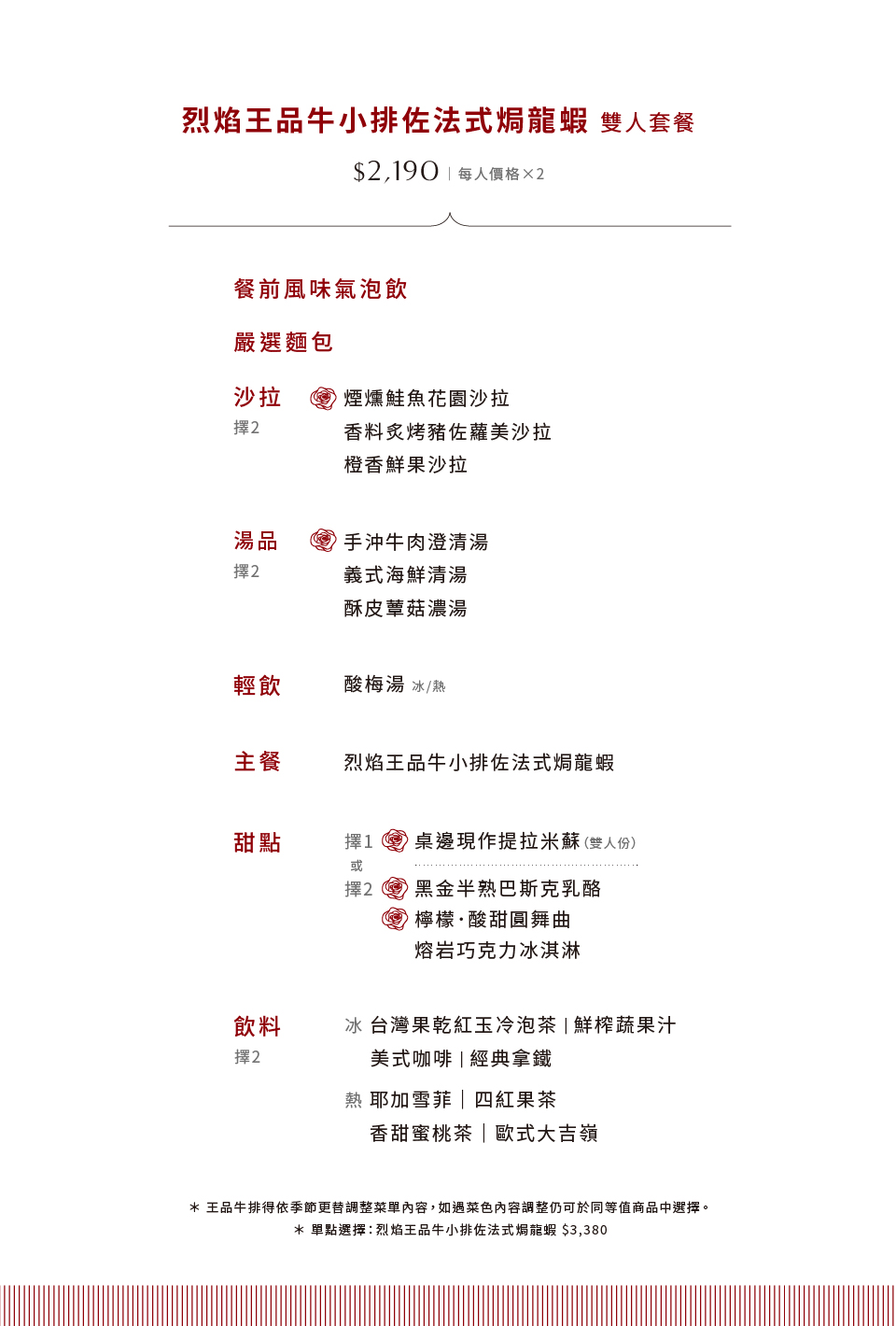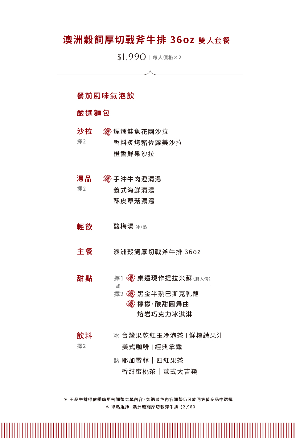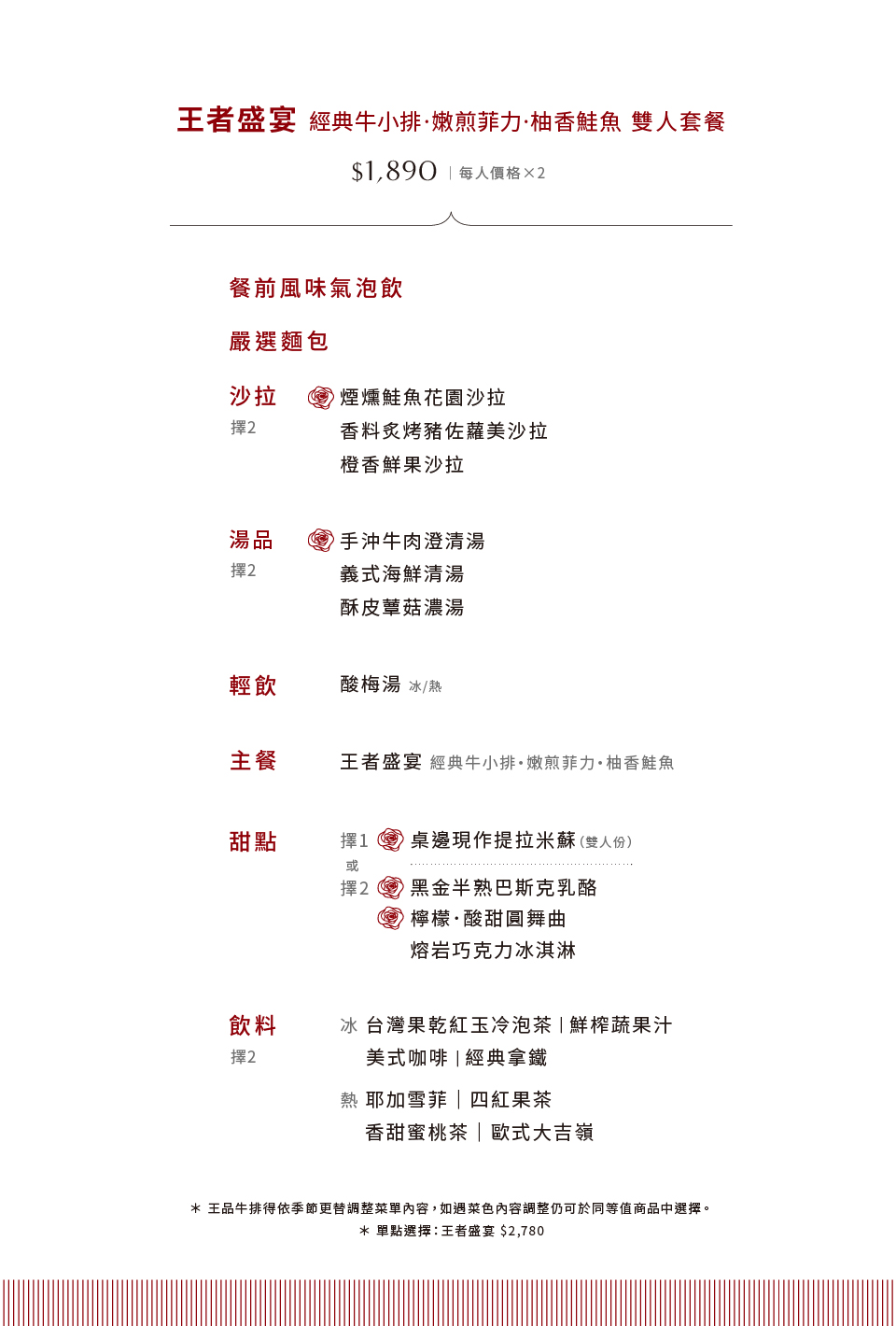 ※王品牛排得依季節更替調整菜單內容,如遇菜色內容調整仍可於同等值商品中選擇。