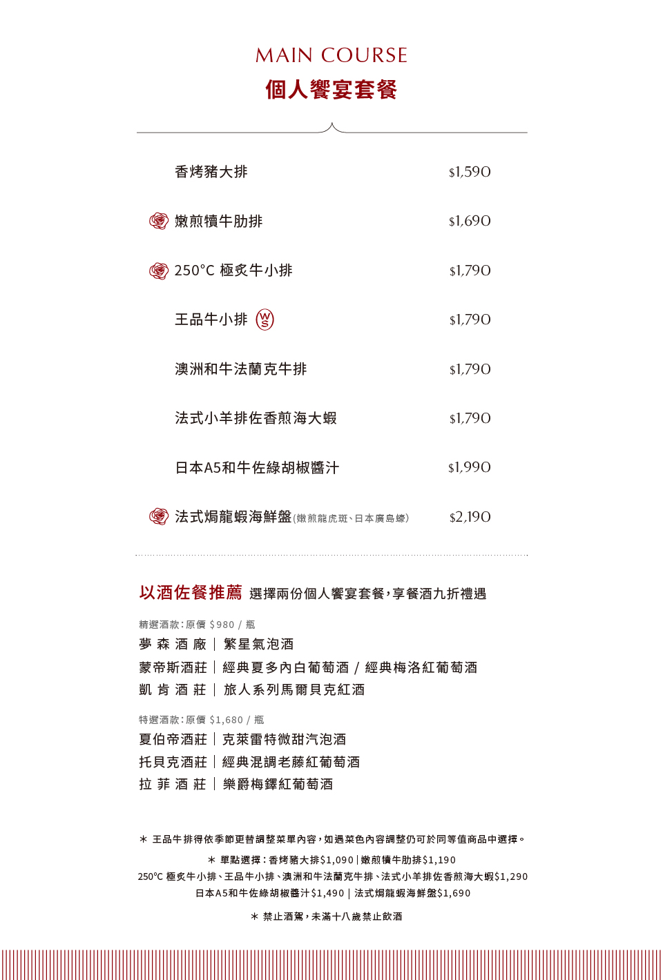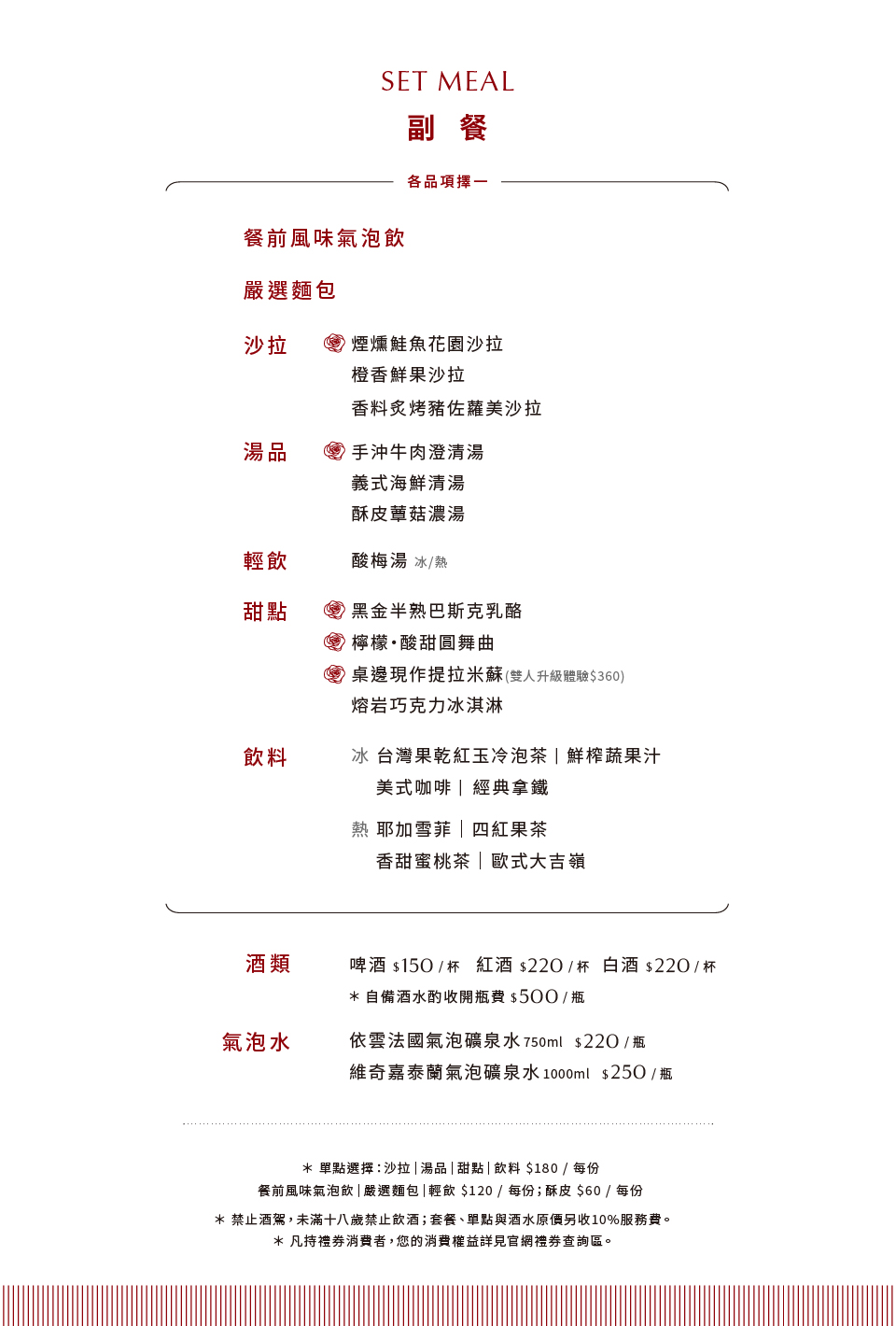 ※單點與酒類不適用禮券消費;自備酒水酌收取開瓶費$500元/瓶。